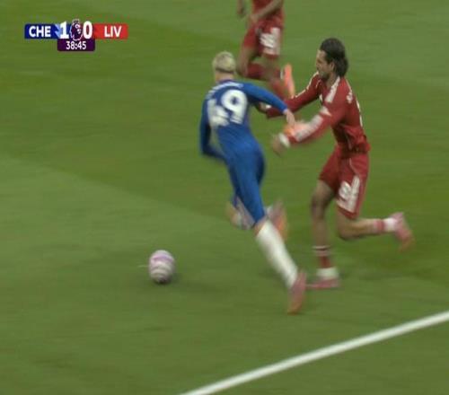 比賽第39分鐘,加納喬在索博斯洛伊的防守下倒在禁區(qū)內(nèi),主裁判安東尼-泰勒沒有判罰點球,并向?qū)ε辛P表達(dá)異議的切爾西主帥馬雷斯卡出示黃牌。