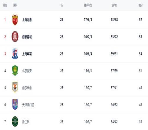 在積分榜上,上海海港以57分高居榜首。排名第2的是成都蓉城,拿到55分,落后2分,依然有奪冠的希望。上海申花54分排名第3。第4的是北京國安,拿到51分,落后榜首6分,爭冠希望渺茫。而山東泰山拿到平局之后,總積分是43分,升到第5名。天津津門虎也是43分,排名第6。第7的浙江隊拿到39分。