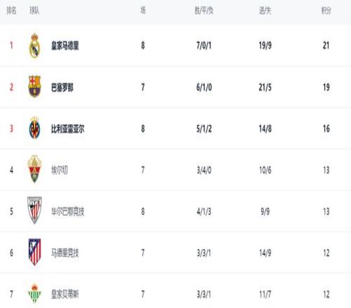 在積分榜上,皇馬暫時(shí)登上了榜首位置。皇馬拿到21個(gè)積分。而巴薩掉到第2名,只拿到19分。不過,巴薩比皇馬少踢1場。比利亞雷亞爾輸球之后,依然是16分,排名第3。埃爾切和畢爾巴鄂競技都是13分,排名第4和第5。馬競3勝3平1負(fù),拿到12分,排名第6。皇家貝蒂斯和西班牙人也是12分,排名第7和第8。