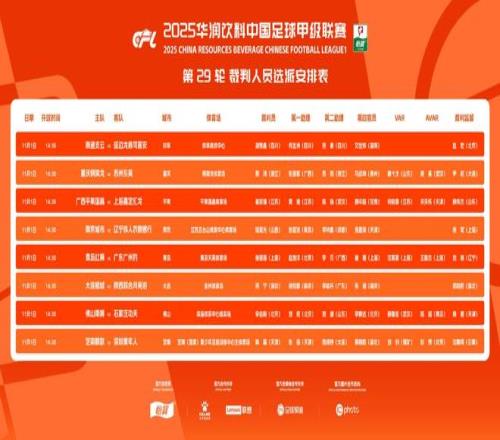 11月1日14:30,2025賽季中甲聯賽第29輪也就是倒數第2輪8場比賽同時開球。賽前,中國足協發布了本輪裁判人員選派安排。