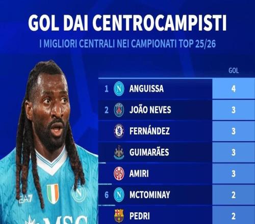 北京時間10月29日,德轉統計出了本賽季至今歐洲五大聯賽中場球員的進球榜,近兩輪意甲連續得分的安古伊薩以4球排名第一,若昂-內維斯、恩佐-費爾南德斯、布魯諾-吉馬良斯以及阿米