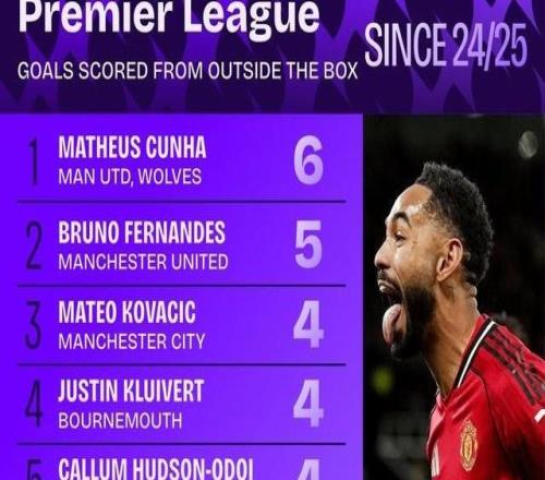 北京時間10月26日,知名數(shù)據(jù)平臺Squawka列出了自上賽季以來,在英超聯(lián)賽中禁區(qū)外進球最多的球員。庫尼亞6球領跑榜單,B費5球位居第二,科瓦契奇4球第三。2024/25賽季以來禁區(qū)外進球